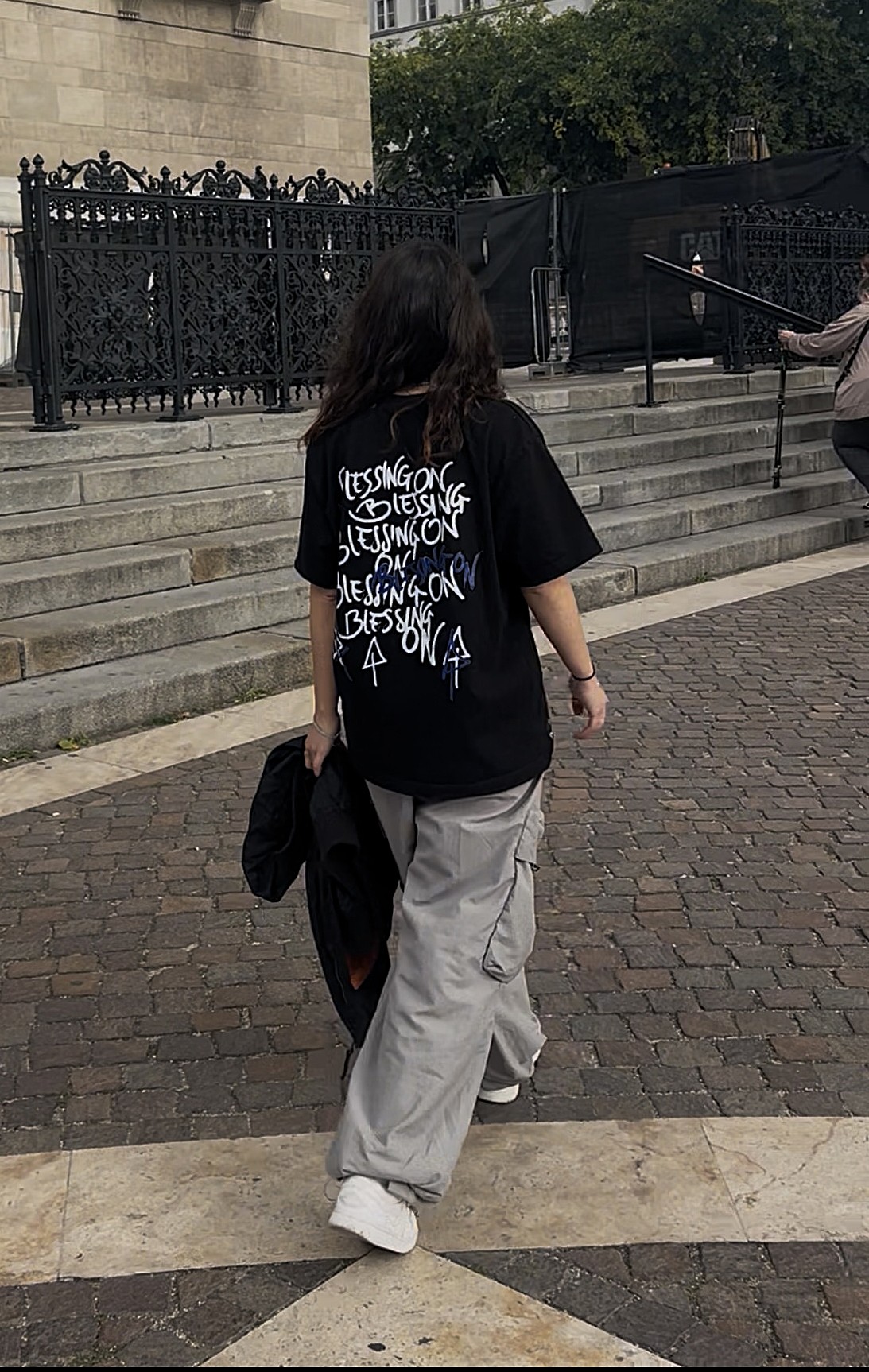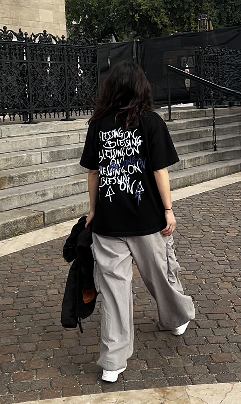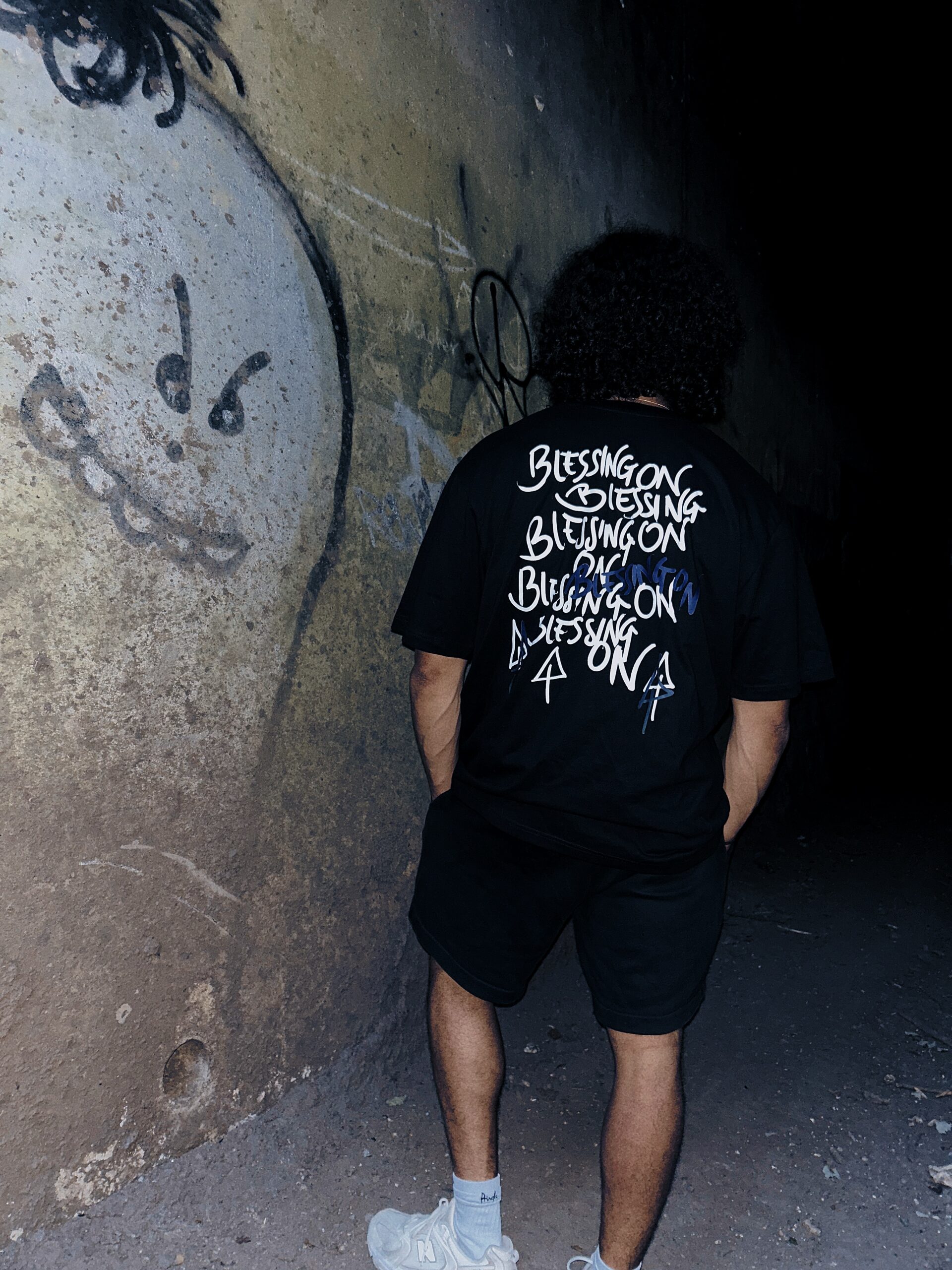 ‘Blessing on Blessing’ runs bold across the back in distressed, layered print — raw, stacked, intentional whilst the front stays understated: Psalm 115:15, small and off-center, a quiet reminder.